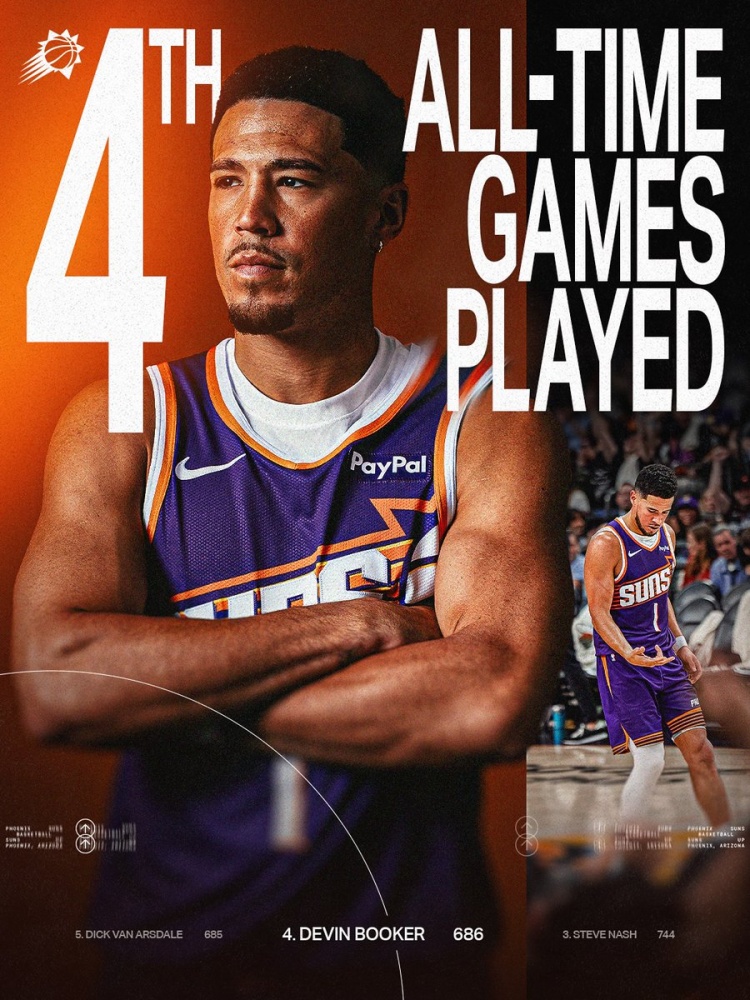 In this campaign, Booker started. According to statistics, this is the 686th game of Booker Suns' career, surpassing Dick Van Arsdale (685) and rising to fourth in team history.