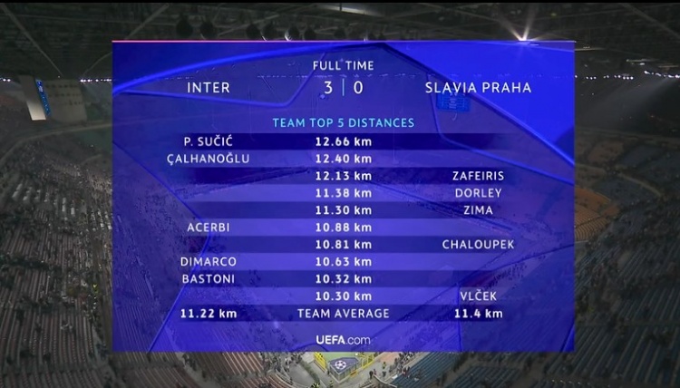 Inter Milan's running distances were the 12.66km of Susic, followed by 12.40km of Cialhanoglu, followed by 10.88km of Archerby, 10.63km of Dimarco, and 10.32km of Bastoni.